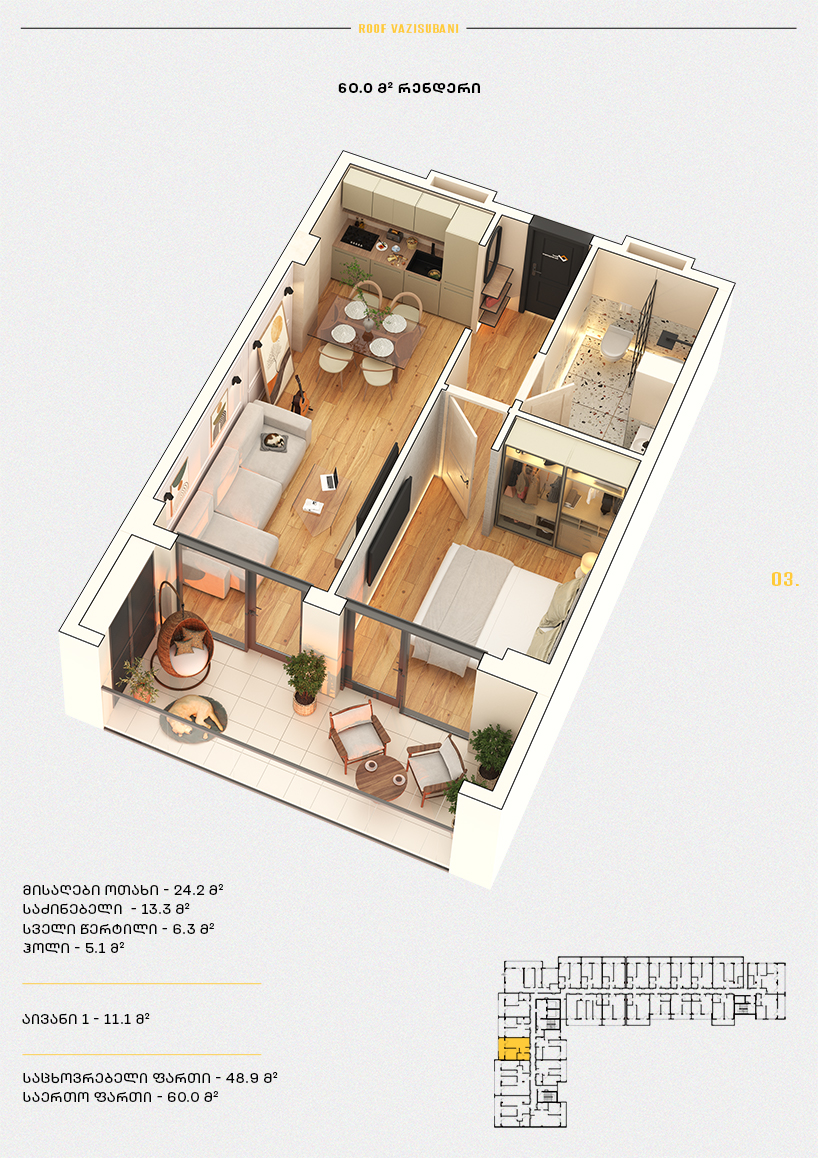 საერთო ფართი: 59.7 კვ.მ